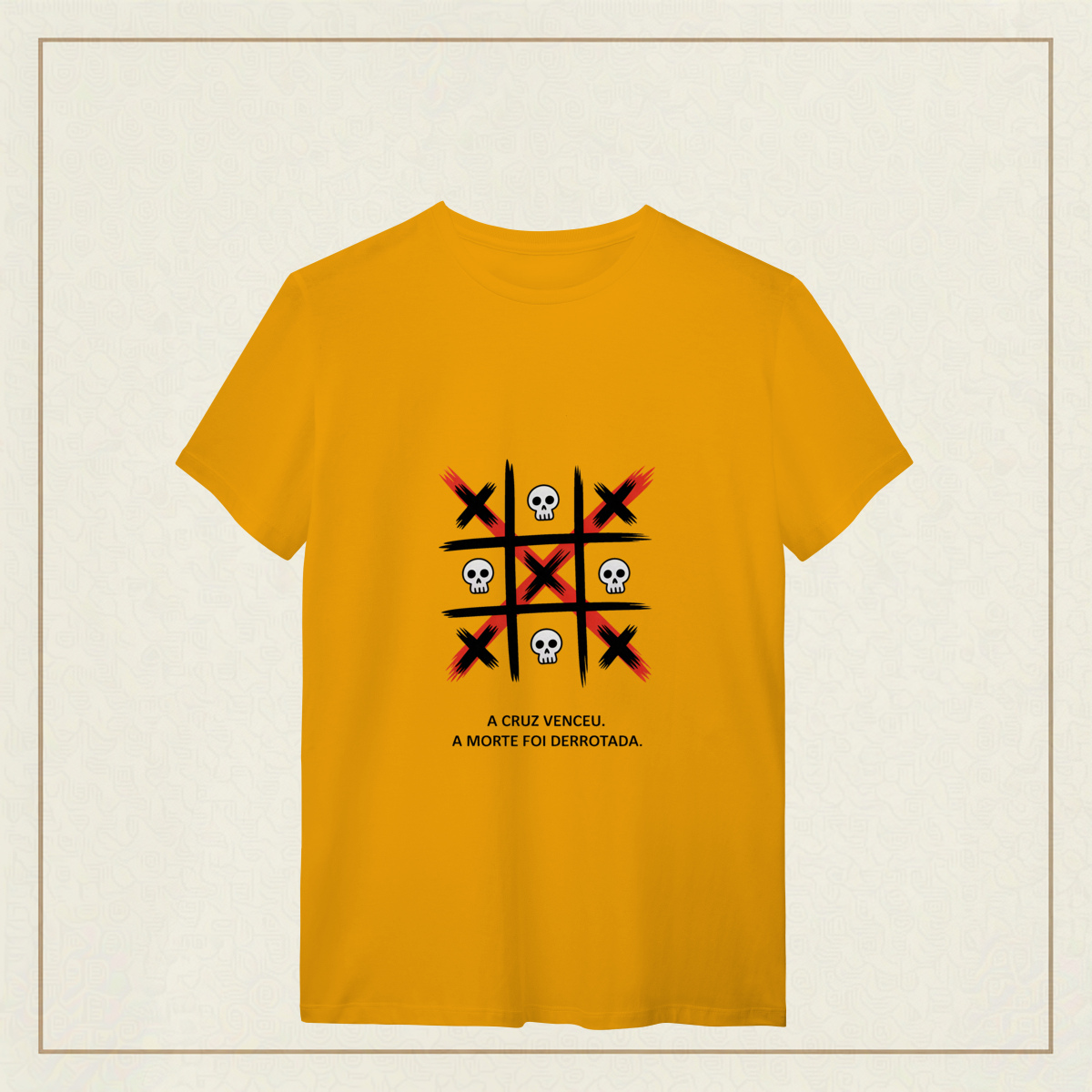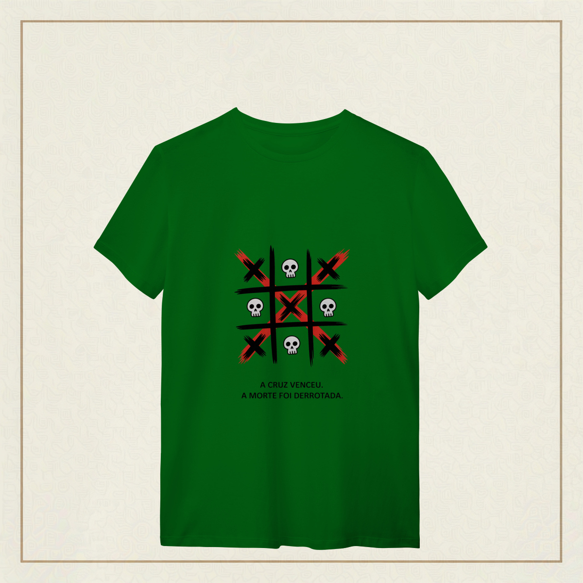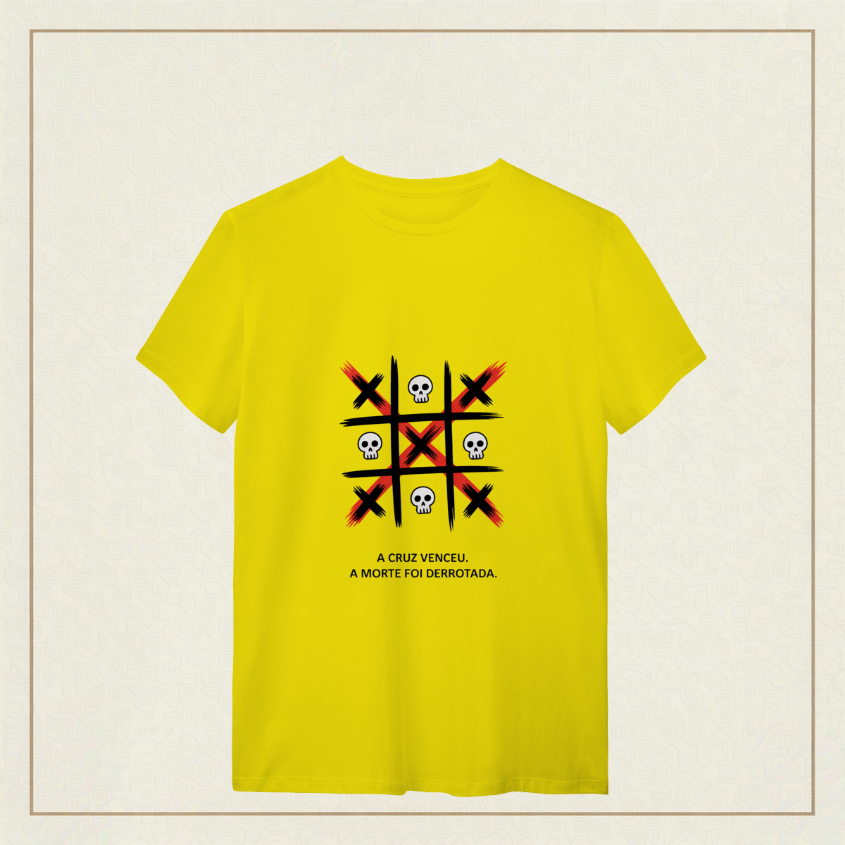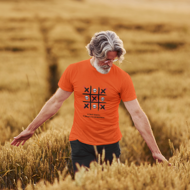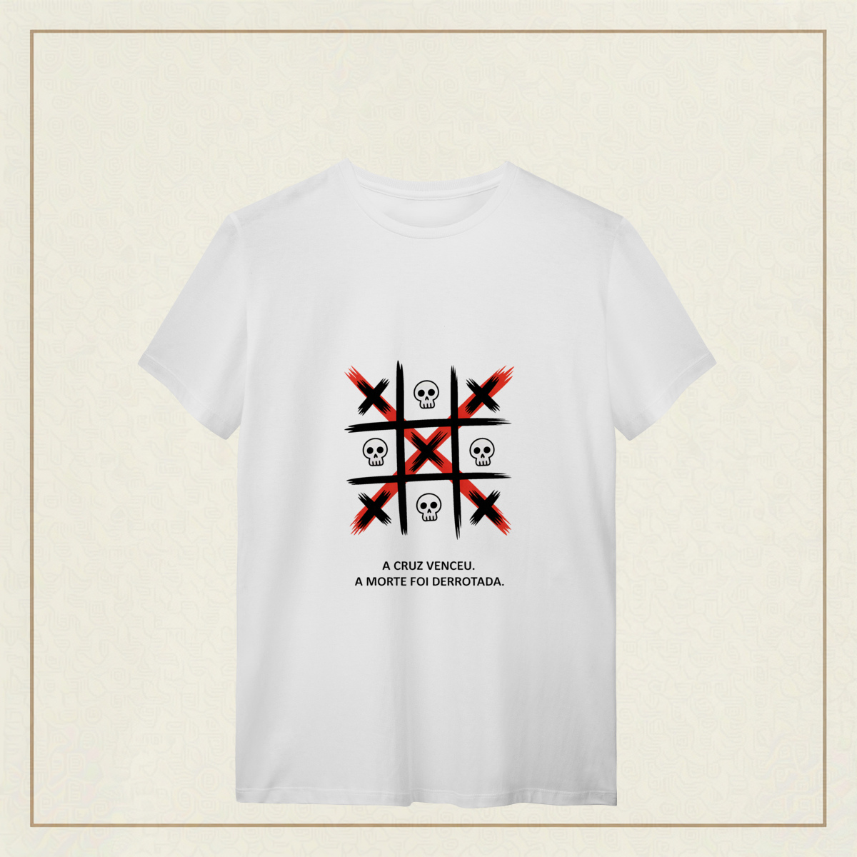Uma estampa que representa a verdade central da fé cristã: A vitória de Cristo sobre a morte. Inspirada no poder da cruz, a arte simboliza o triunfo da vida sobre as trevas e lembra que, através do sacrifício de Jesus, aquilo que parecia derrota se tornou a maior vitória da história. Os elementos visuais contrastam vida e morte para reforçar a mensagem do Evangelho: A cruz não é símbolo de fim, mas de redenção, esperança e nova vida. Uma peça marcante para quem carrega no coração a certeza de que, em Cristo, a morte foi vencida e a esperança permanece viva.