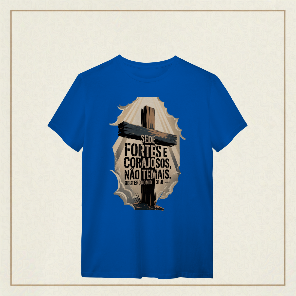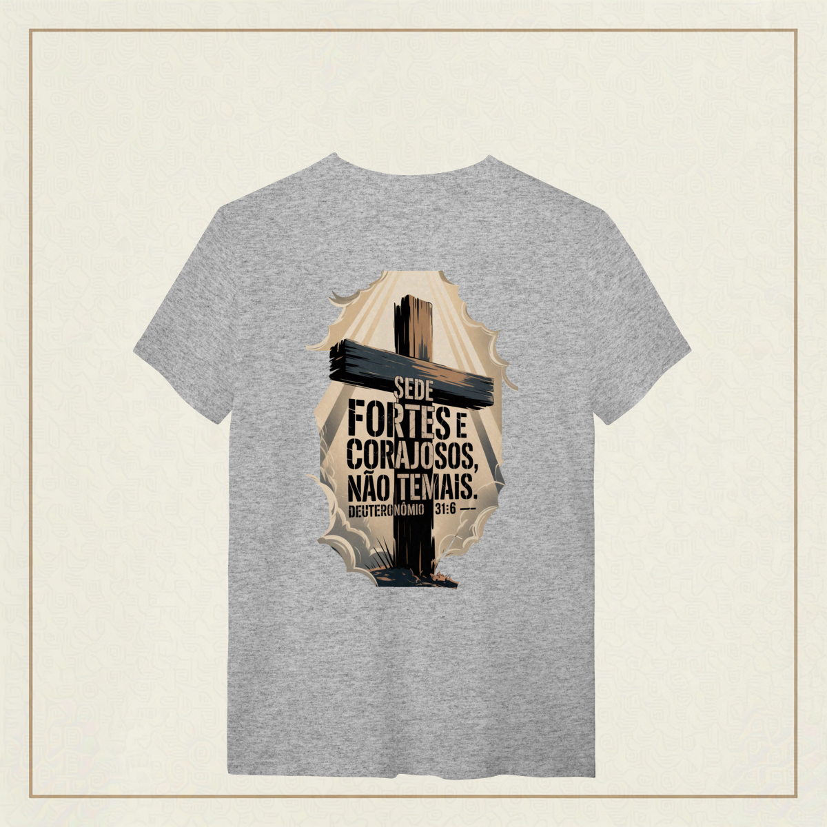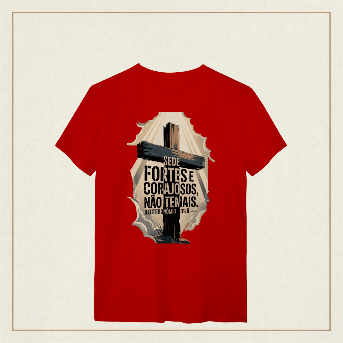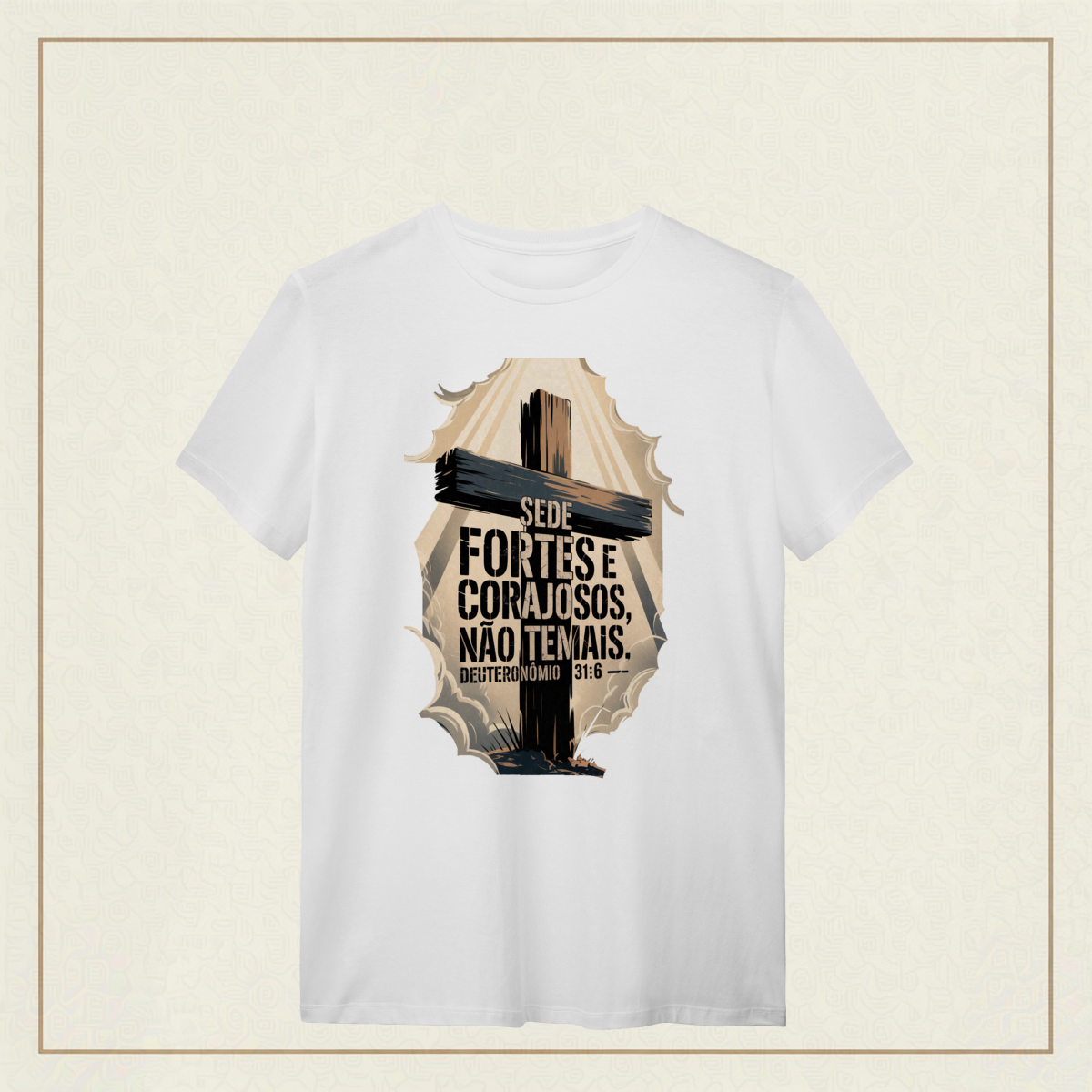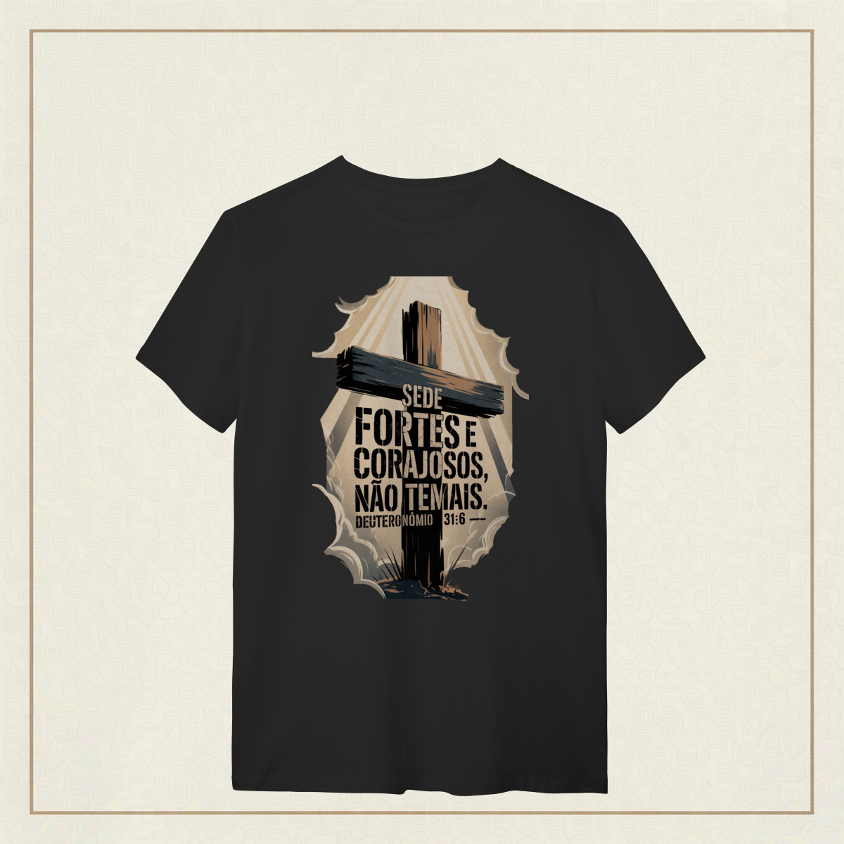 Em meio às batalhas da vida, esta poderosa imagem inspirada em Deuteronômio 31:6 traz um chamado à firmeza espiritual e à confiança em Deus. A cruz imponente e os céus rasgados pela luz divina simbolizam que, mesmo nas tempestades, a força e a coragem vêm d’Aquele que nunca nos abandona. "Sede fortes e corajosos, não temais." Deuteronômio 31:6