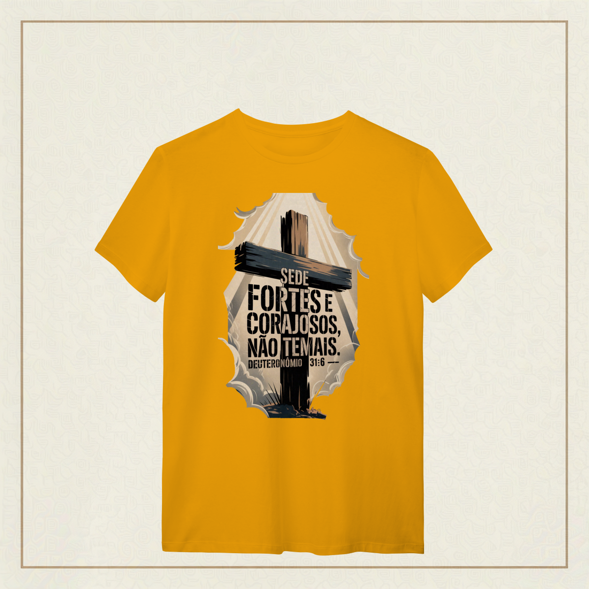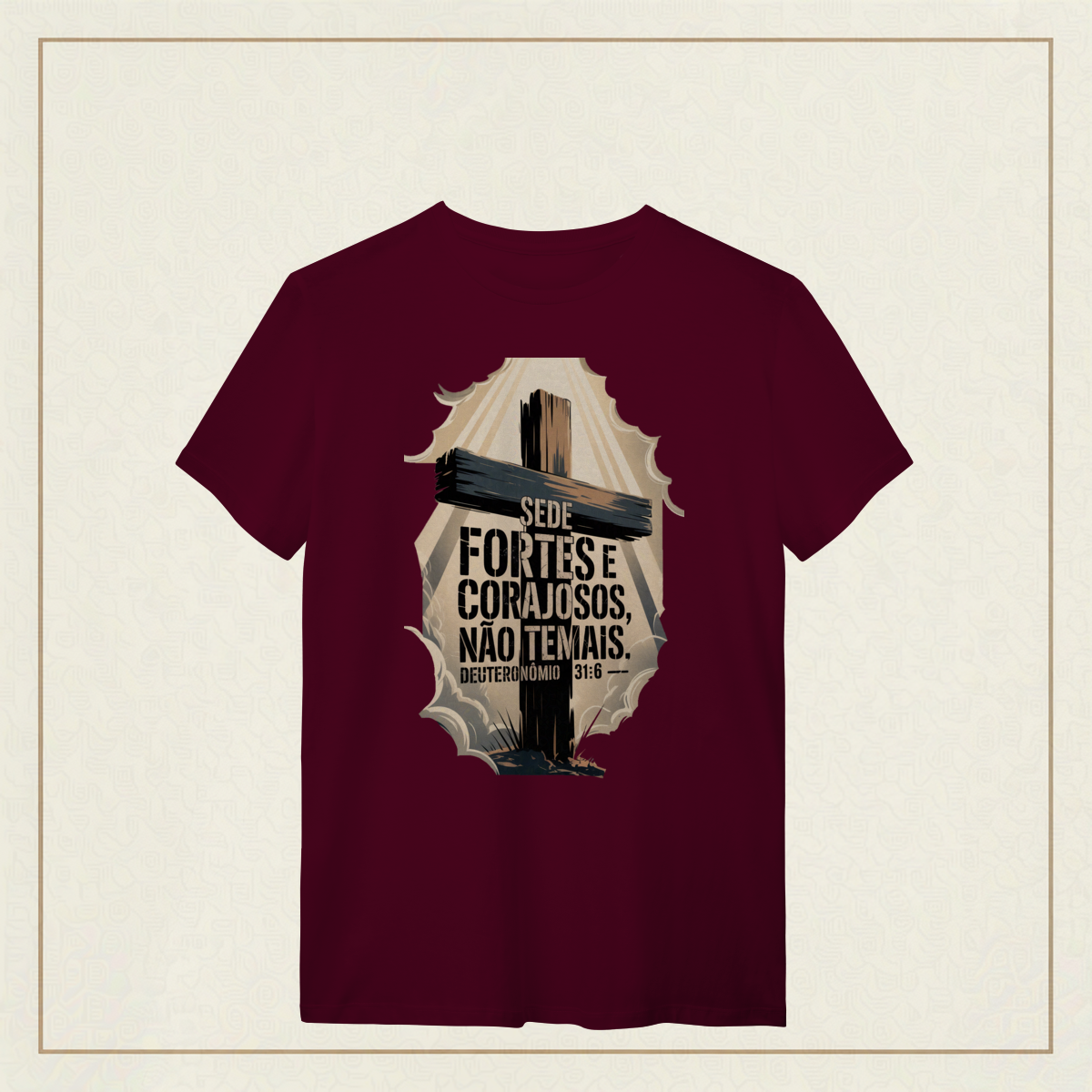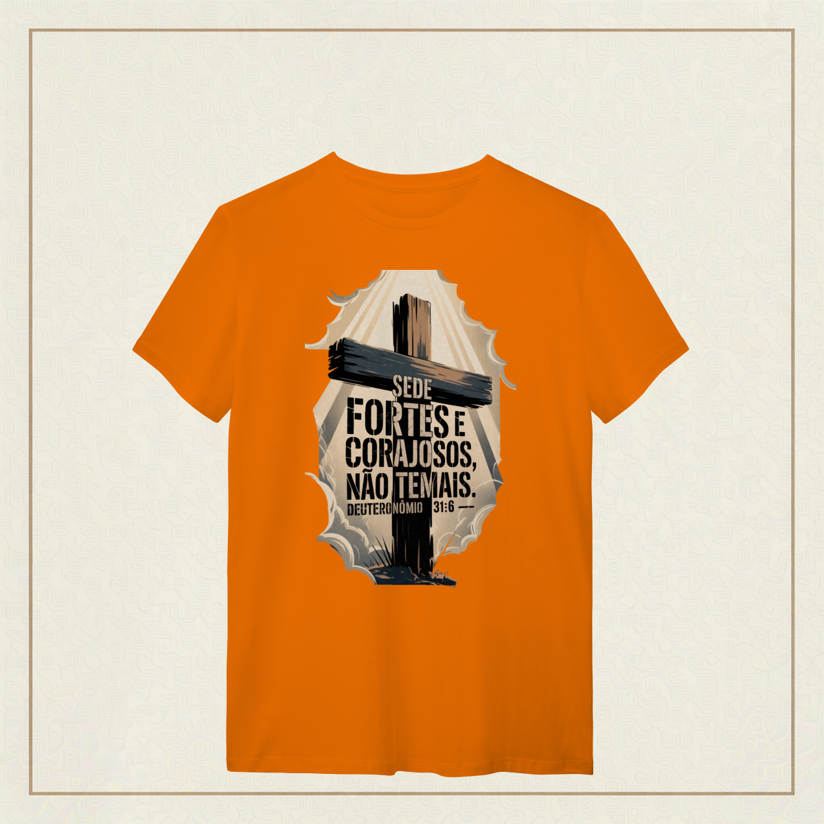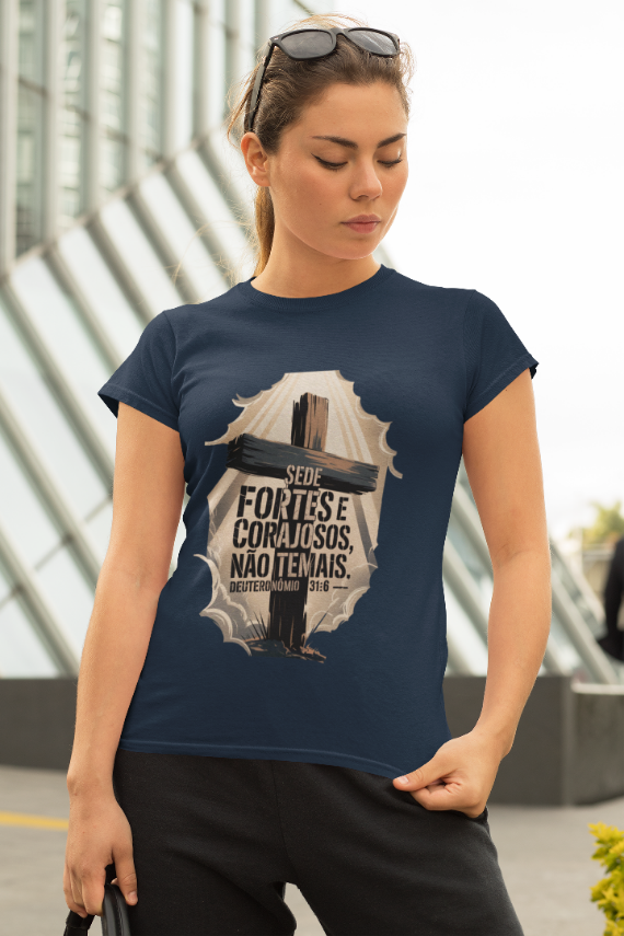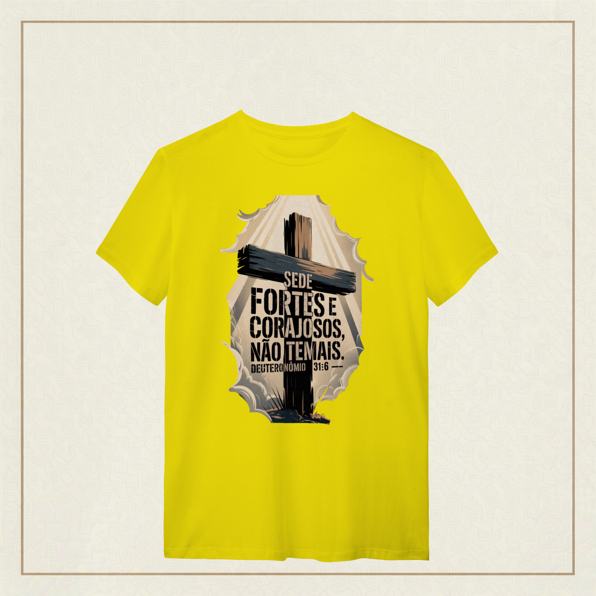 Em meio às batalhas da vida, esta poderosa imagem inspirada em Deuteronômio 31:6 traz um chamado à firmeza espiritual e à confiança em Deus. A cruz imponente e os céus rasgados pela luz divina simbolizam que, mesmo nas tempestades, a força e a coragem vêm d’Aquele que nunca nos abandona. "Sede fortes e corajosos, não temais." Deuteronômio 31:6
