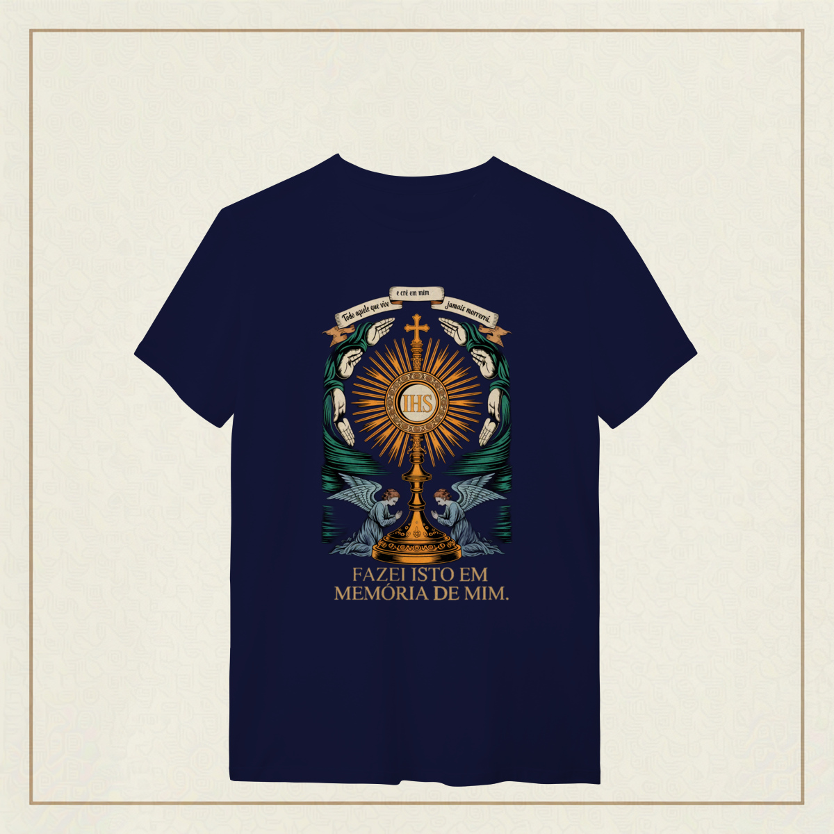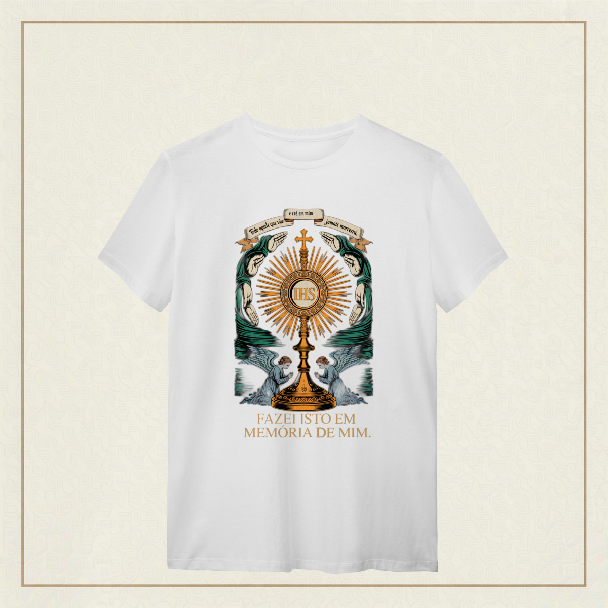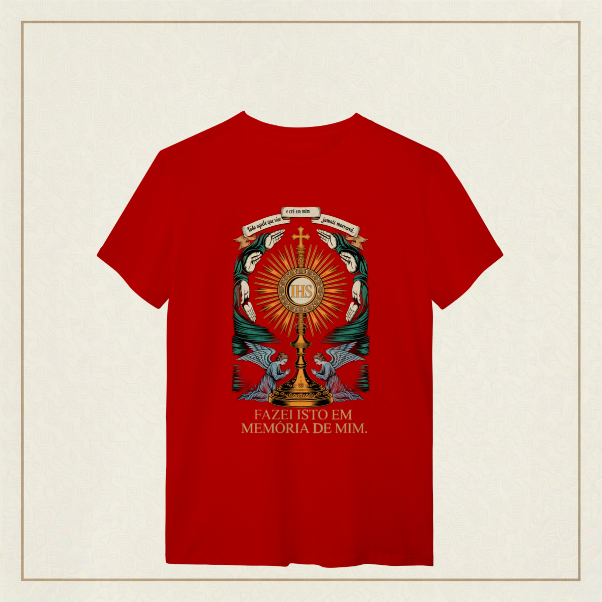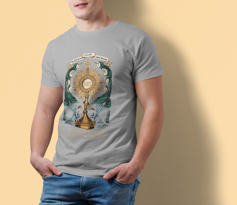 Um tributo sublime à Eucaristia, onde o sagrado se revela em cada traço. No centro, o ostensório reluz com a inscrição IHS, símbolo do nome de Jesus, irradiando luz divina e cercado por mãos em reverência e anjos em adoração. Acima, o lembrete eterno: "Todo aquele que vive e crê em mim jamais morrerá. "A frase ao final, "Fazei isto em memória de mim", ecoa a promessa da vida eterna e a centralidade do sacrifício de Cristo. Uma estampa que convida ao recolhimento, à fé e ao mistério da presença real de Jesus no pão consagrado.