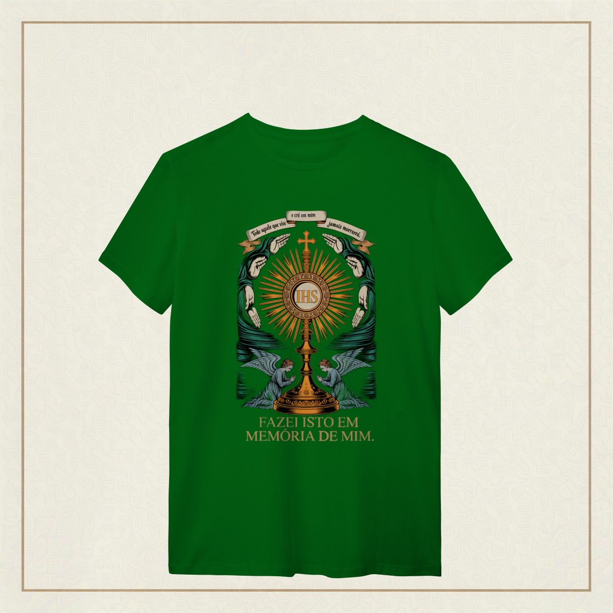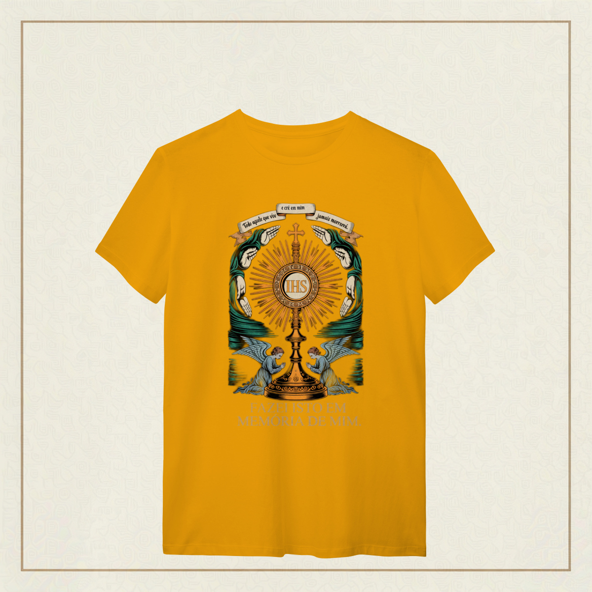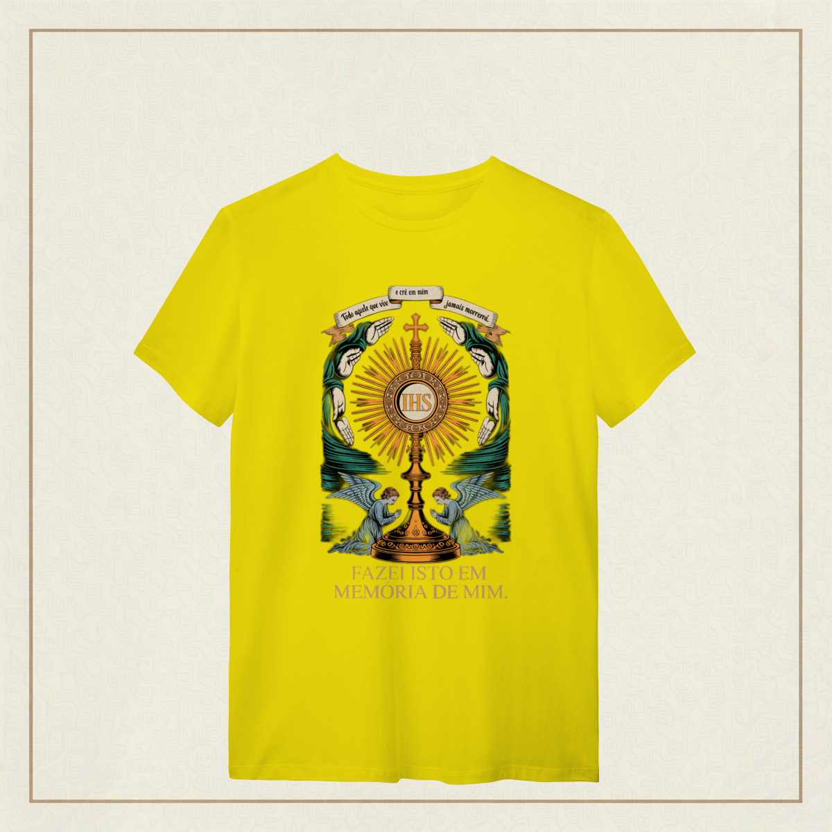 Um tributo sublime à Eucaristia, onde o sagrado se revela em cada traço. No centro, o ostensório reluz com a inscrição IHS, símbolo do nome de Jesus, irradiando luz divina e cercado por mãos em reverência e anjos em adoração. Acima, o lembrete eterno: "Todo aquele que vive e crê em mim jamais morrerá. "A frase ao final, "Fazei isto em memória de mim", ecoa a promessa da vida eterna e a centralidade do sacrifício de Cristo. Uma estampa que convida ao recolhimento, à fé e ao mistério da presença real de Jesus no pão consagrado.