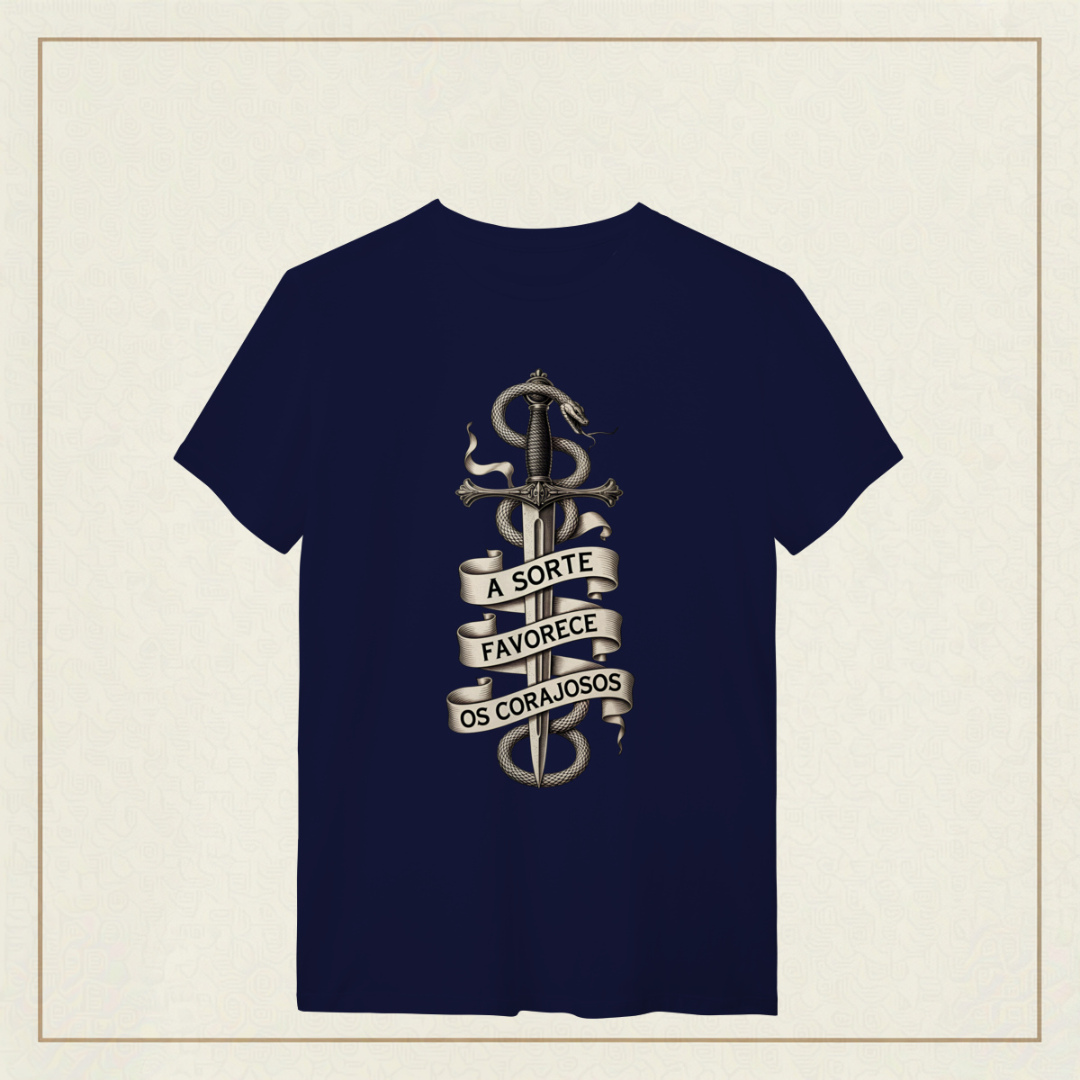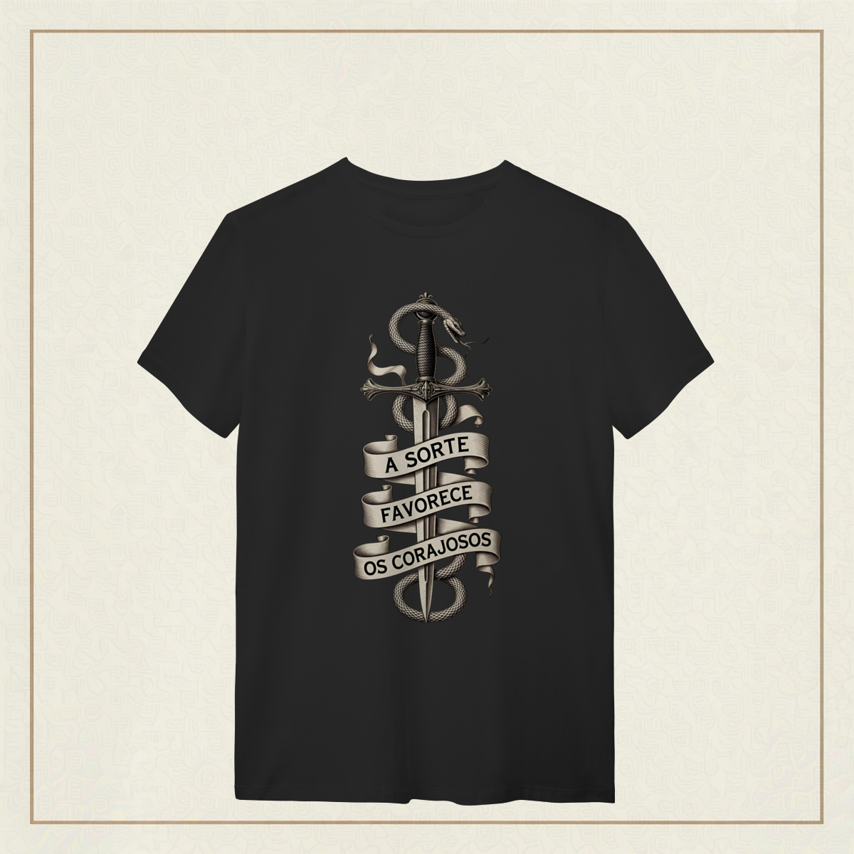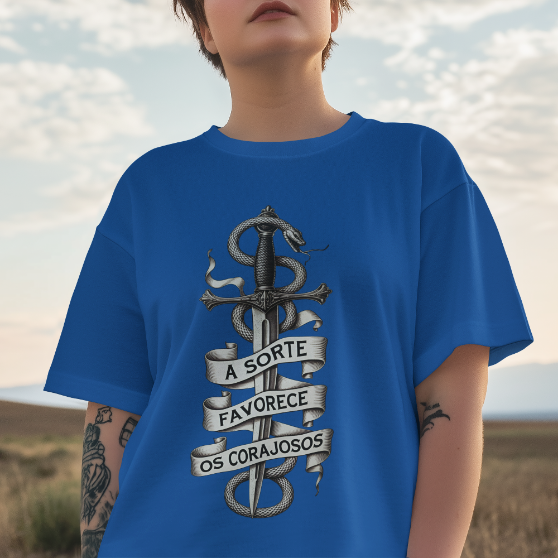 Uma arte ousada e simbólica, onde a espada representa a determinação inabalável e a serpente que a envolve simboliza o desafio, a astúcia e o perigo. A faixa com a frase "A sorte favorece os corajosos" exalta a bravura como chave para enfrentar os riscos da vida. Com traços marcantes em estilo gravura e uma estética clássica em preto e branco, essa estampa é um verdadeiro chamado à ação. Feita para quem sabe que o destino sorri apenas para aqueles que têm coragem de encará-lo de frente.