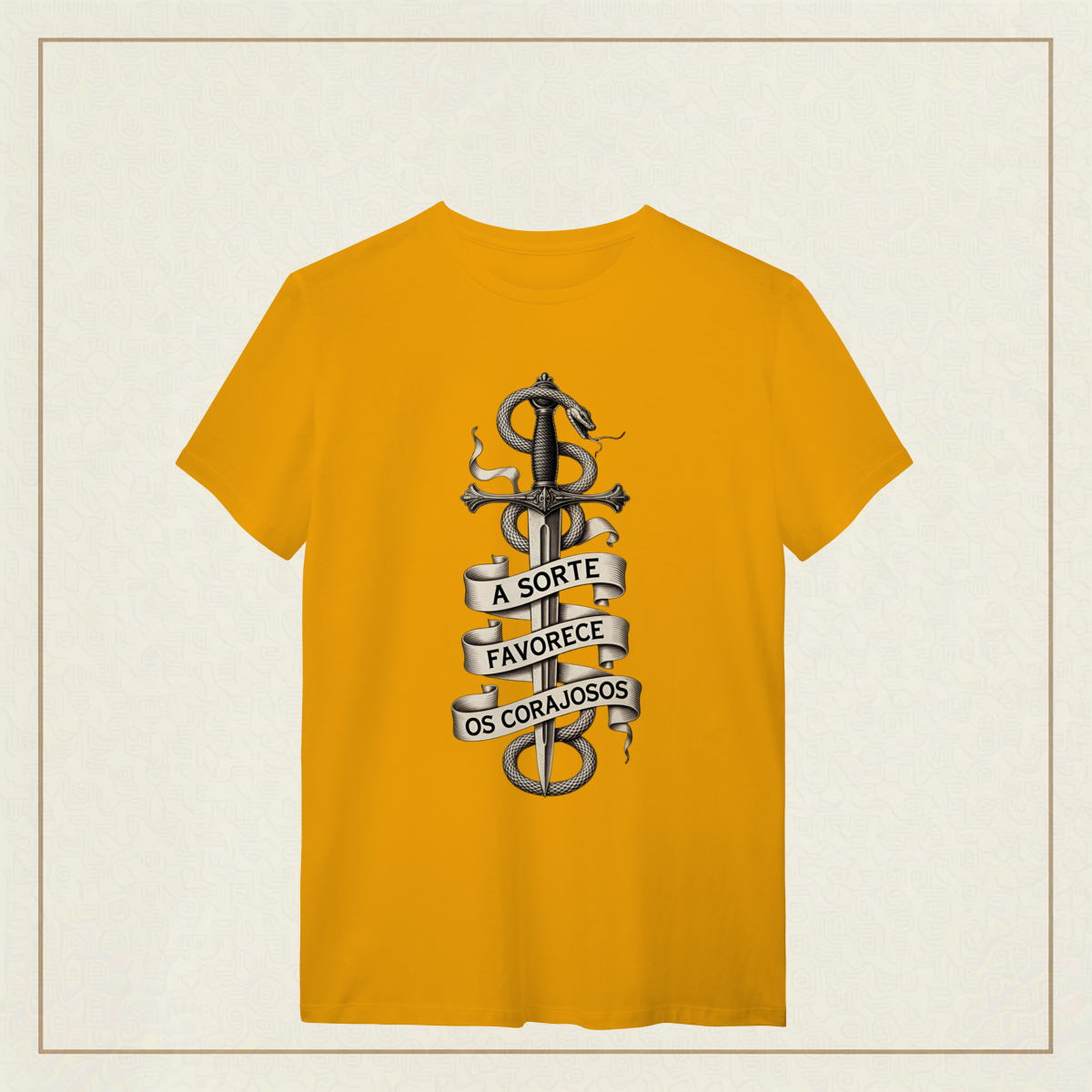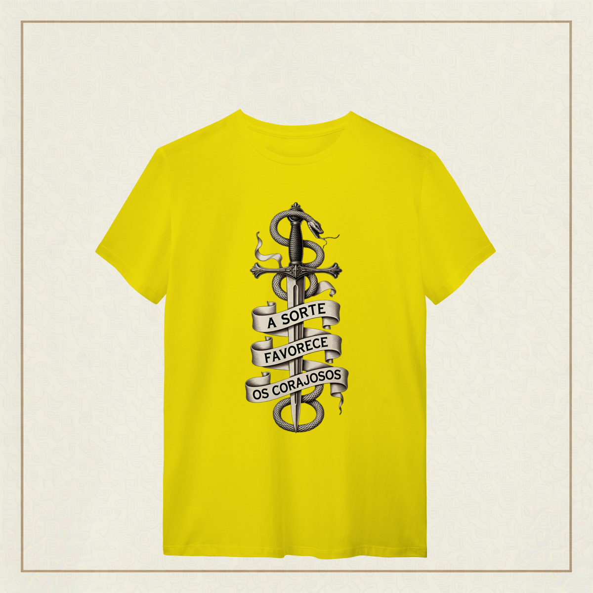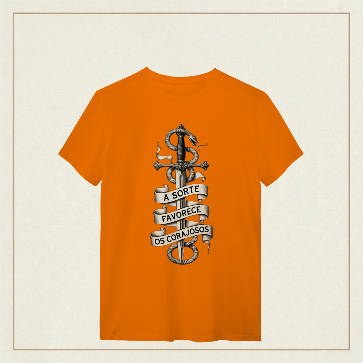 Uma arte ousada e simbólica, onde a espada representa a determinação inabalável e a serpente que a envolve simboliza o desafio, a astúcia e o perigo. A faixa com a frase "A sorte favorece os corajosos" exalta a bravura como chave para enfrentar os riscos da vida. Com traços marcantes em estilo gravura e uma estética clássica em preto e branco, essa estampa é um verdadeiro chamado à ação. Feita para quem sabe que o destino sorri apenas para aqueles que têm coragem de encará-lo de frente.
