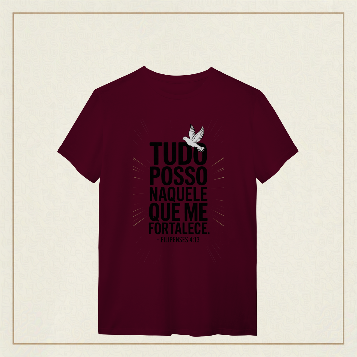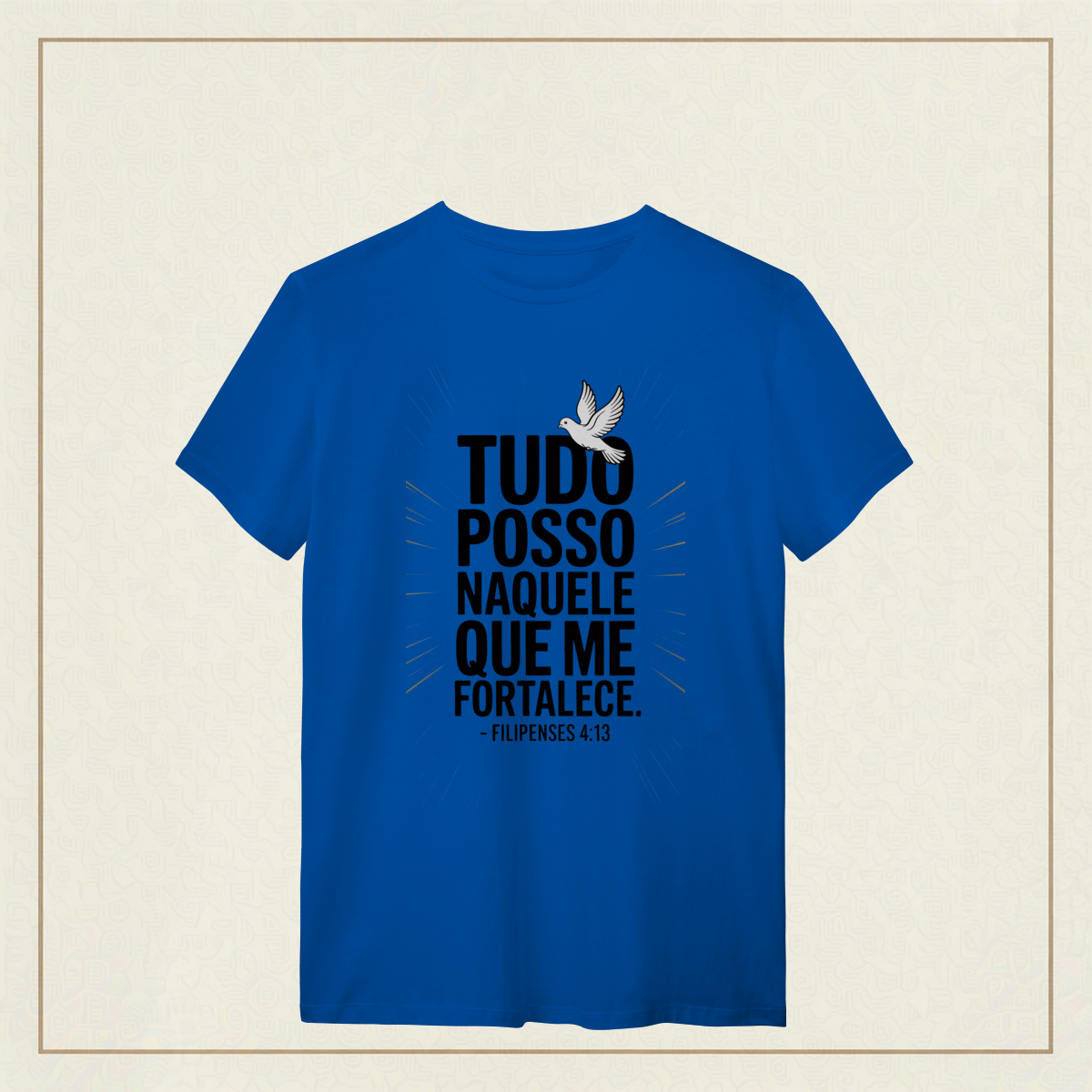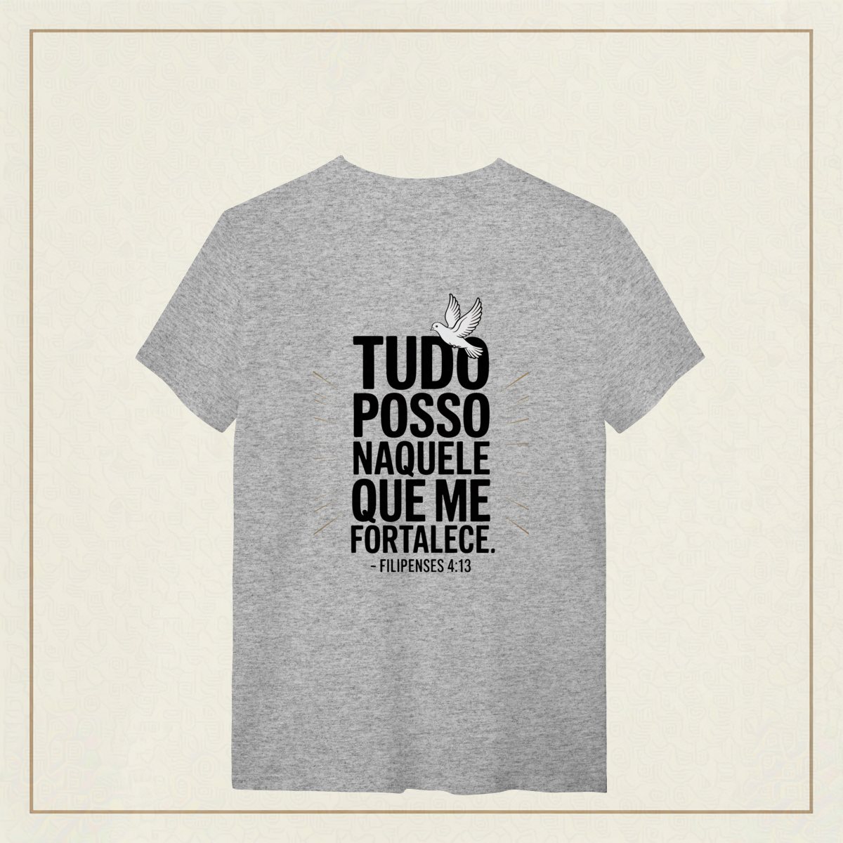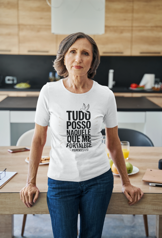 Há uma força que não vem de nós, mas habita em nós quando confiamos plenamente. Esta estampa é a declaração de quem enfrenta o mundo com coragem, não por si, mas por Aquele que sustenta cada passo.