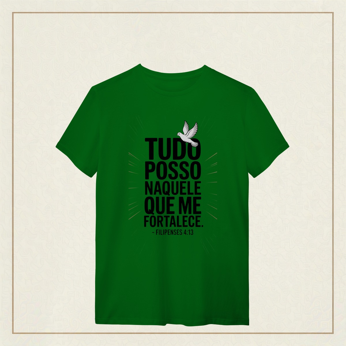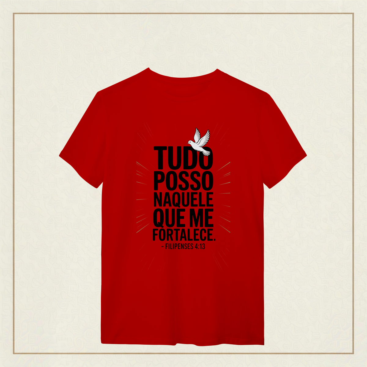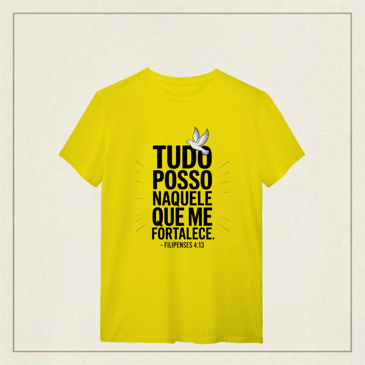 Há uma força que não vem de nós, mas habita em nós quando confiamos plenamente. Esta estampa é a declaração de quem enfrenta o mundo com coragem, não por si, mas por Aquele que sustenta cada passo.