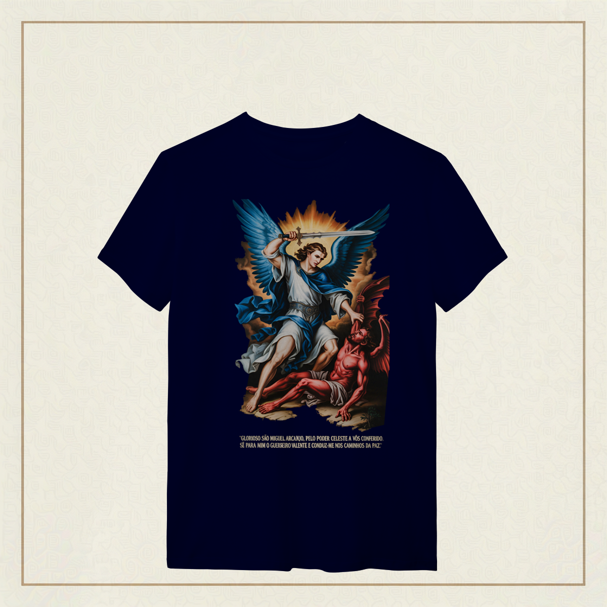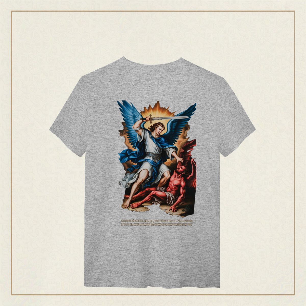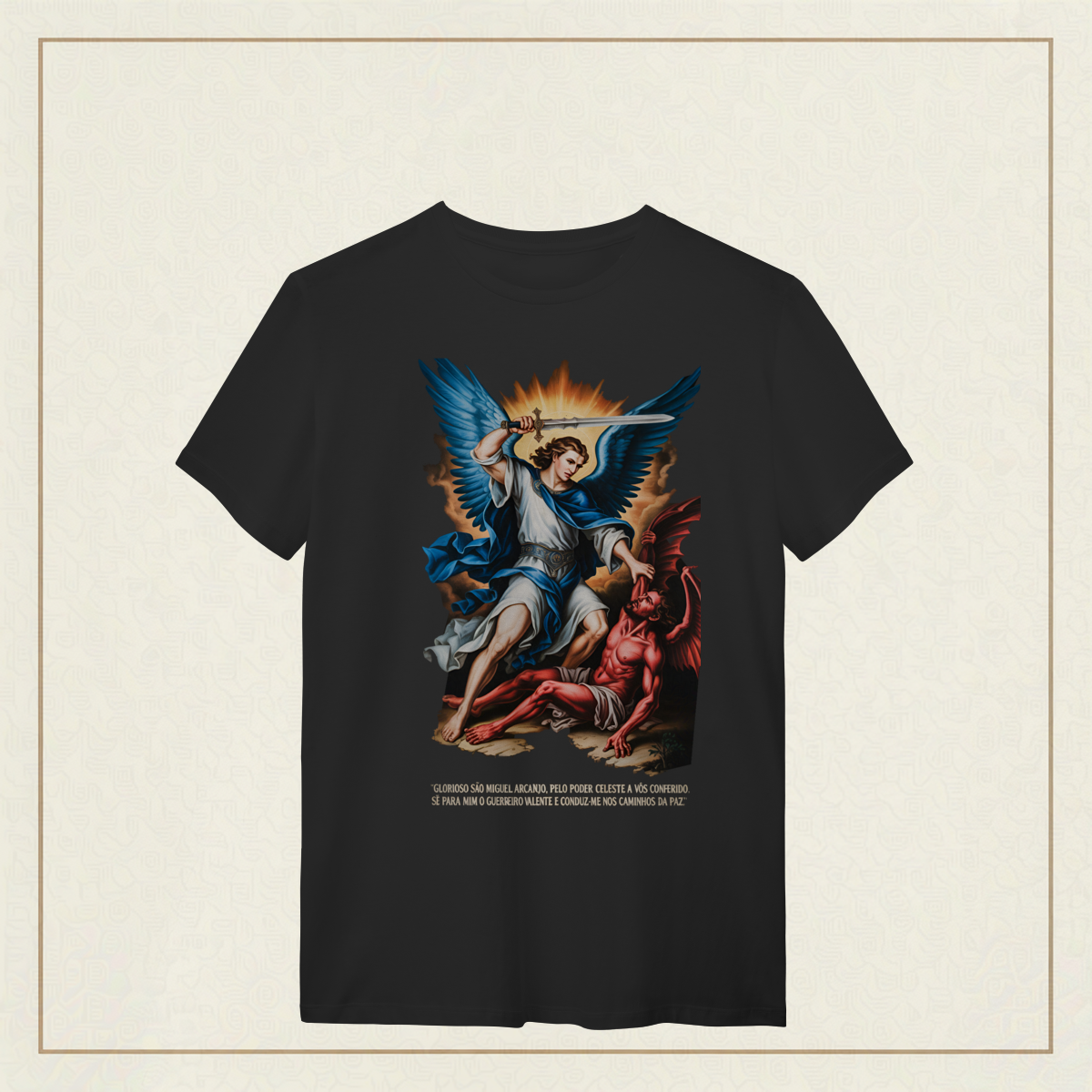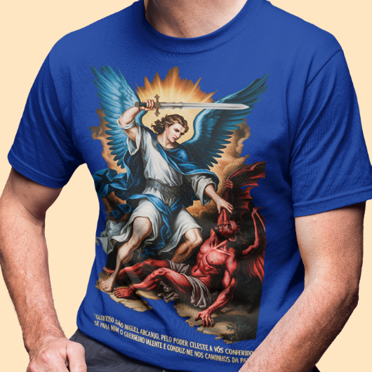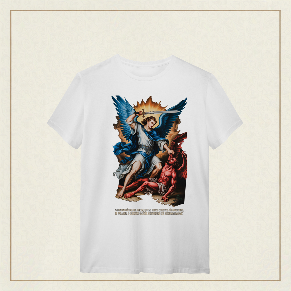 Inspirada na oração tradicional, essa estampa celebra o poder protetor de São Miguel Arcanjo, o guerreiro celestial que luta por nós contra o mal. Uma peça para quem carrega fé, coragem e busca caminhar sob a luz e a paz de Deus.