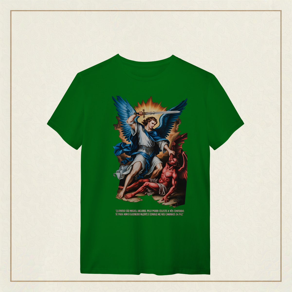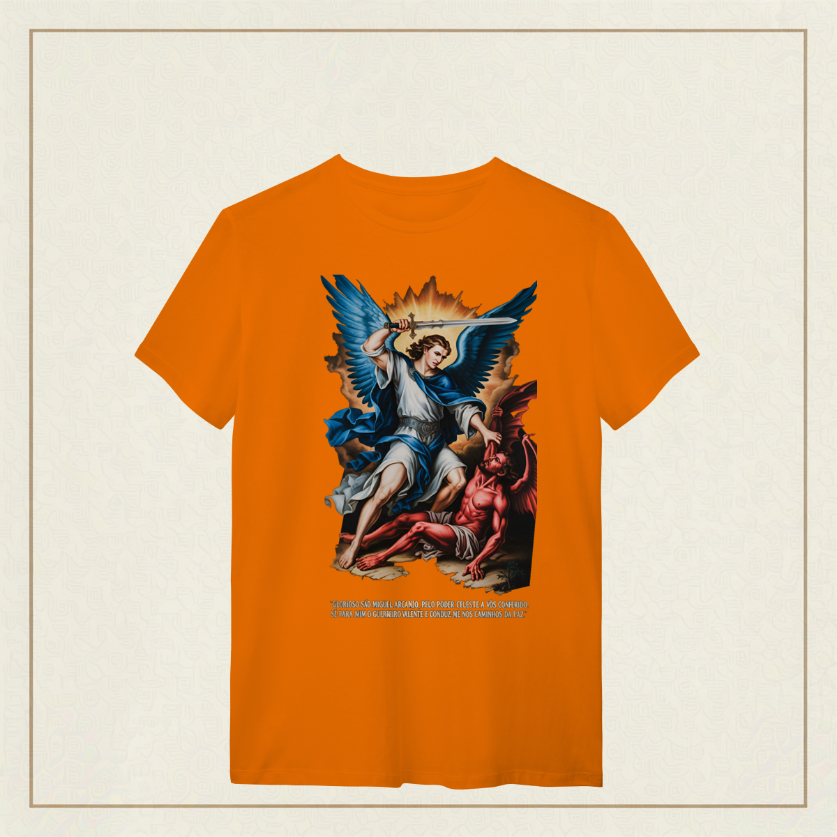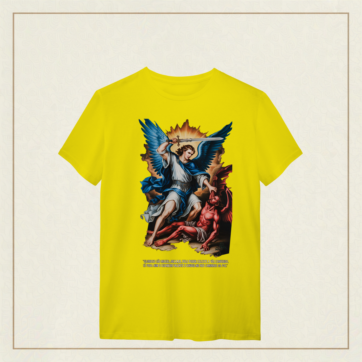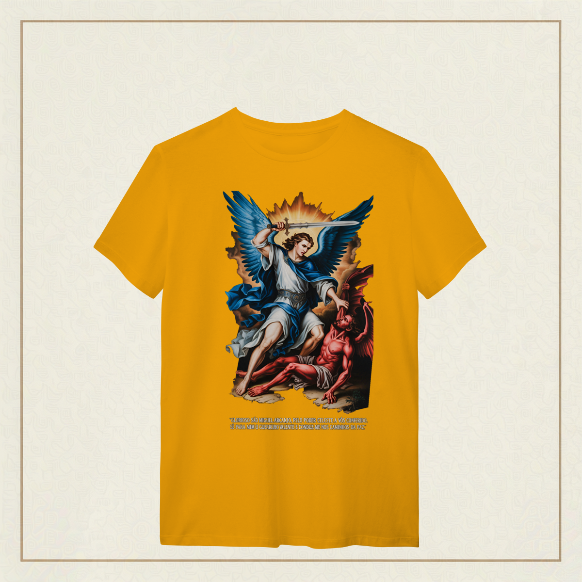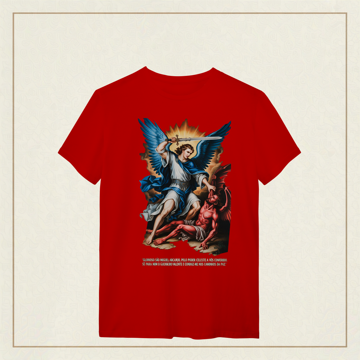 Inspirada na oração tradicional, essa estampa celebra o poder protetor de São Miguel Arcanjo, o guerreiro celestial que luta por nós contra o mal. Uma peça para quem carrega fé, coragem e busca caminhar sob a luz e a paz de Deus.