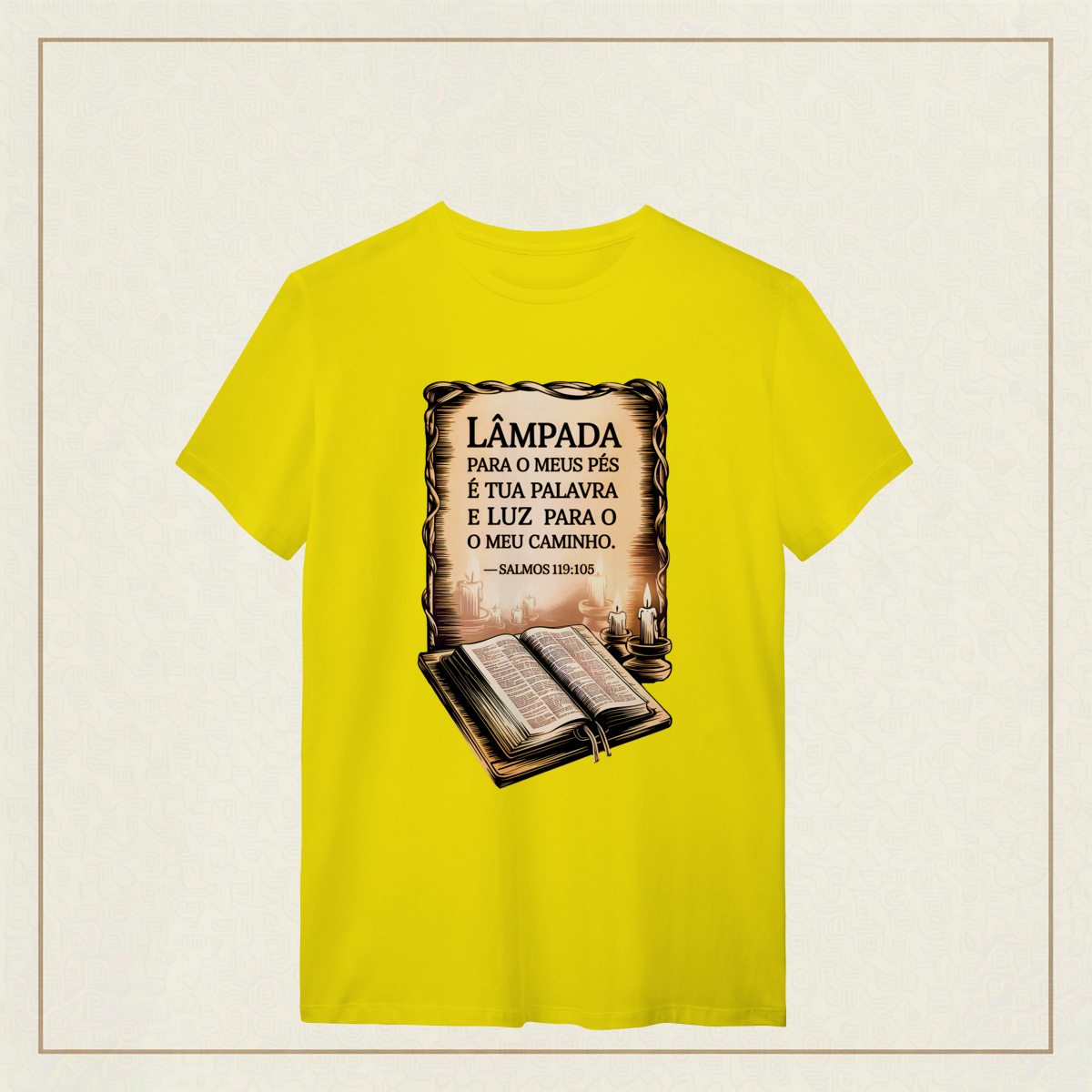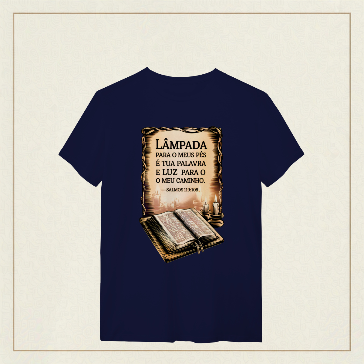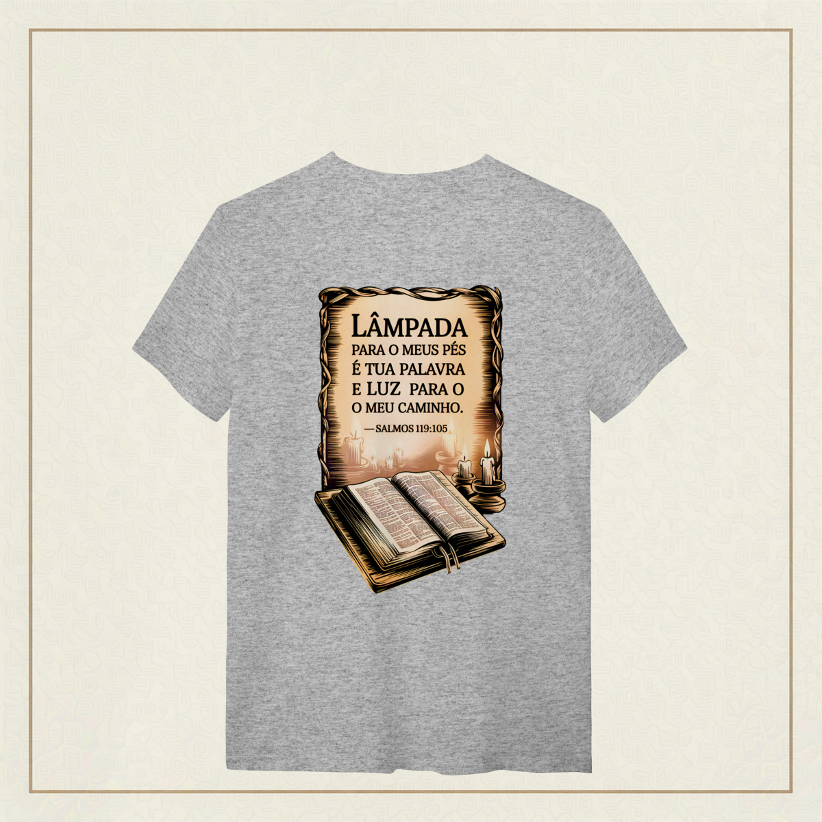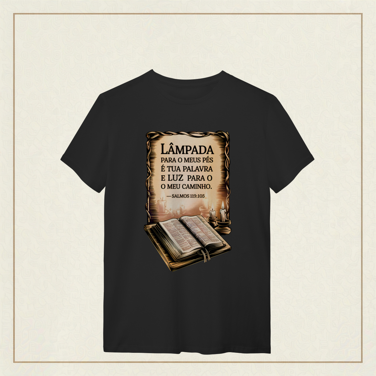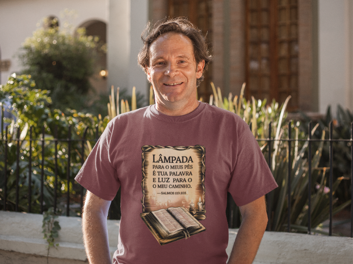 Um lembrete sagrado de que a Palavra de Deus é o guia que ilumina nossos passos mesmo nas noites mais escuras. Com estilo clássico e reverente, essa estampa transmite a paz, a direção e a confiança que só a fé pode oferecer. Uma verdadeira declaração de quem caminha com a luz divina.