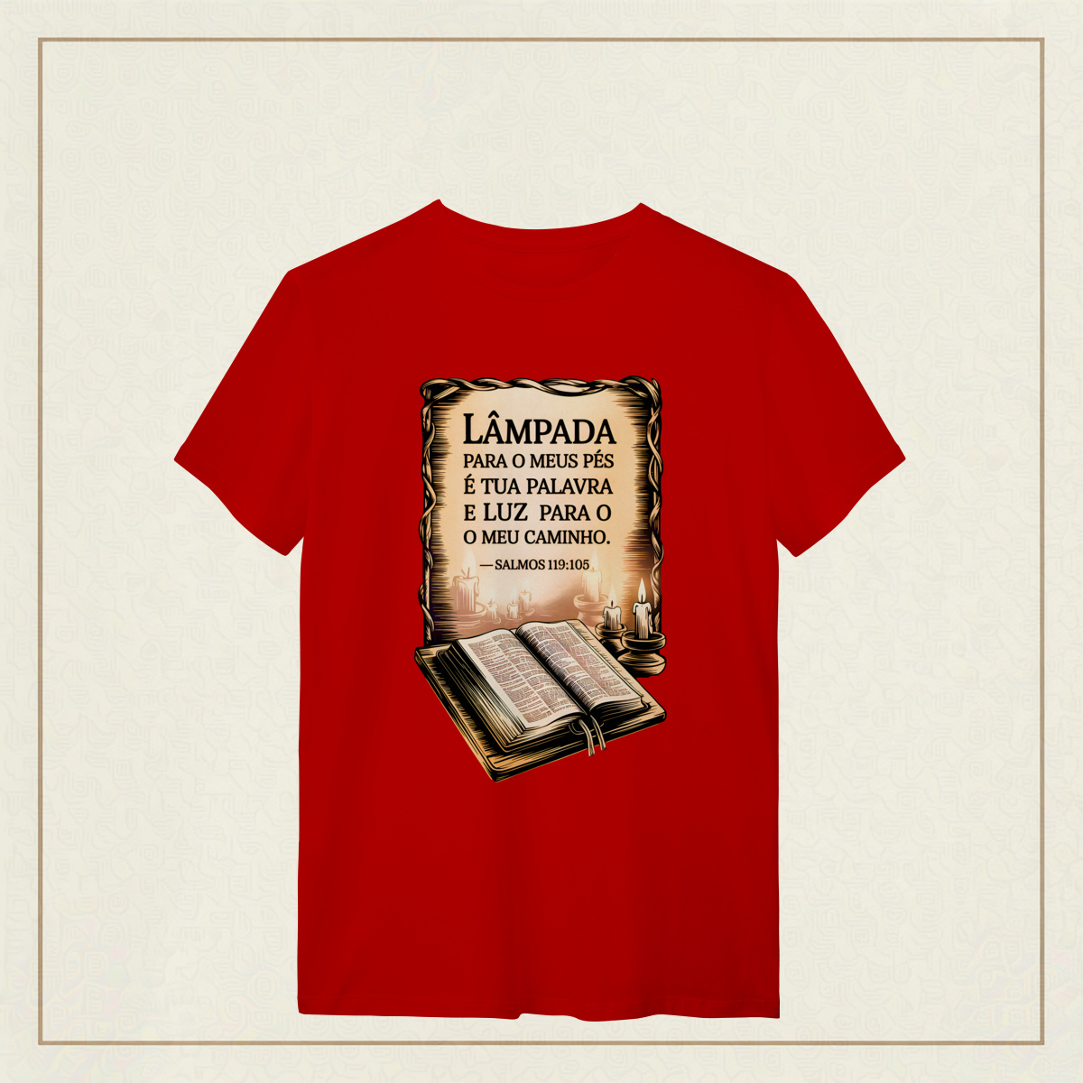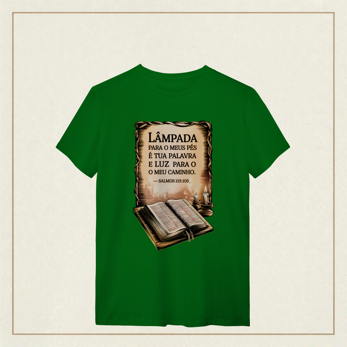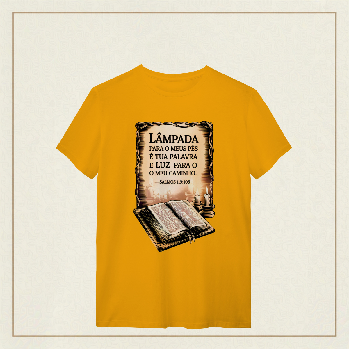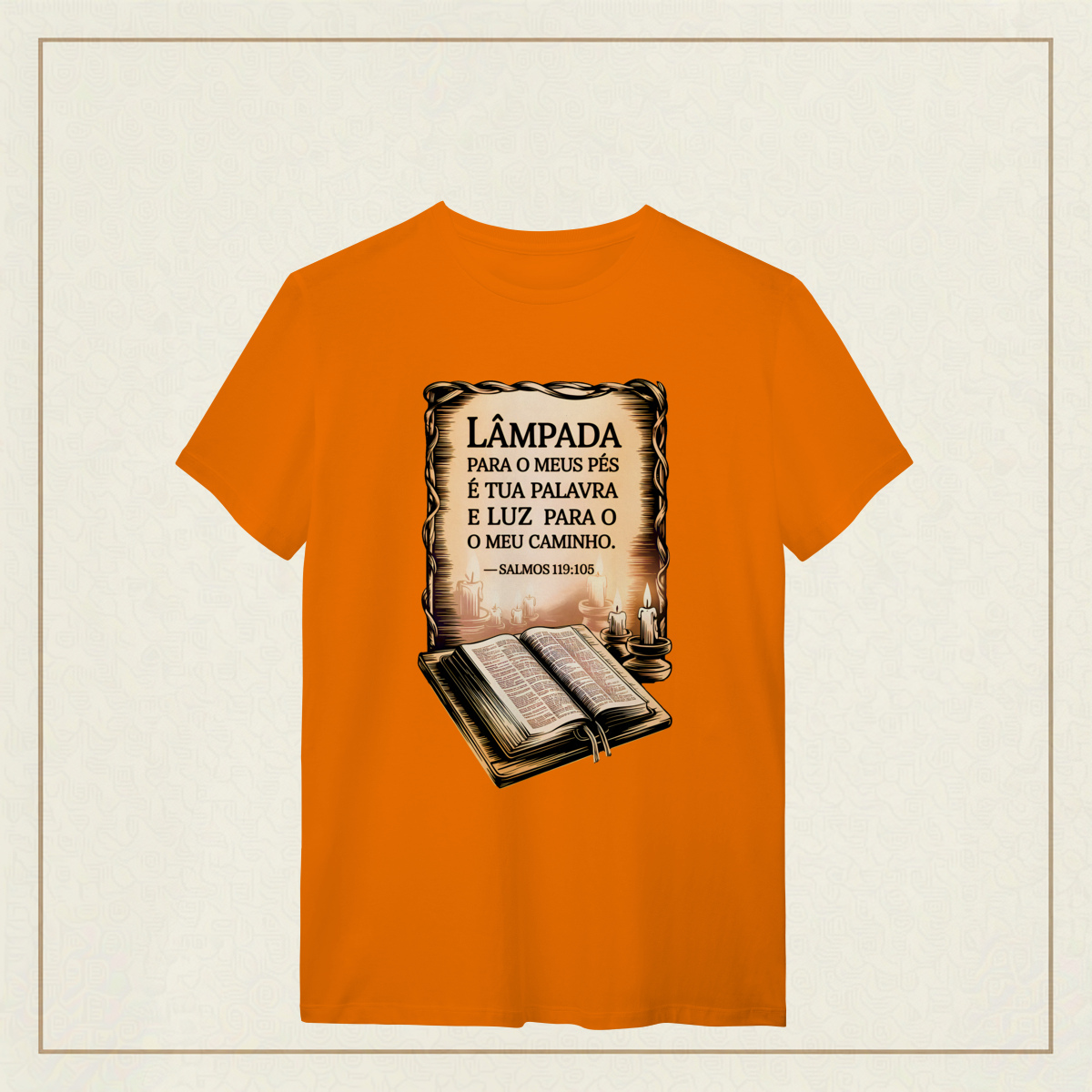 Um lembrete sagrado de que a Palavra de Deus é o guia que ilumina nossos passos mesmo nas noites mais escuras. Com estilo clássico e reverente, essa estampa transmite a paz, a direção e a confiança que só a fé pode oferecer. Uma verdadeira declaração de quem caminha com a luz divina.